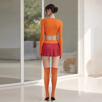 Women Halloween Cosplay Velma and Daphne Costume – Long Sleeve V Neck Crop Top & Mini Skirt Set