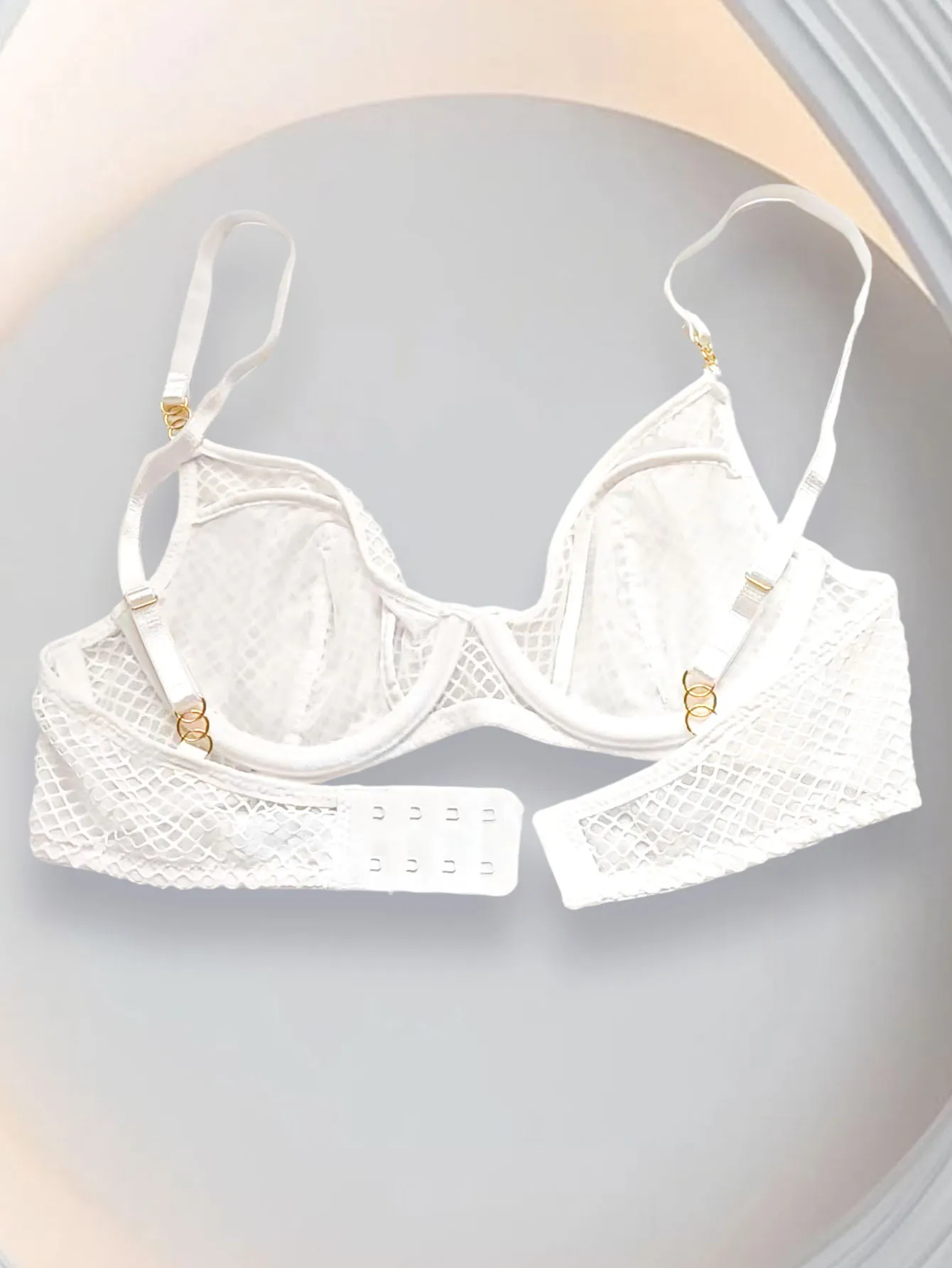Gold Hardware: Elegant gold metal rings connect the straps to the cups and adorn the center gore, adding a jewelry-like touch to the white mesh.