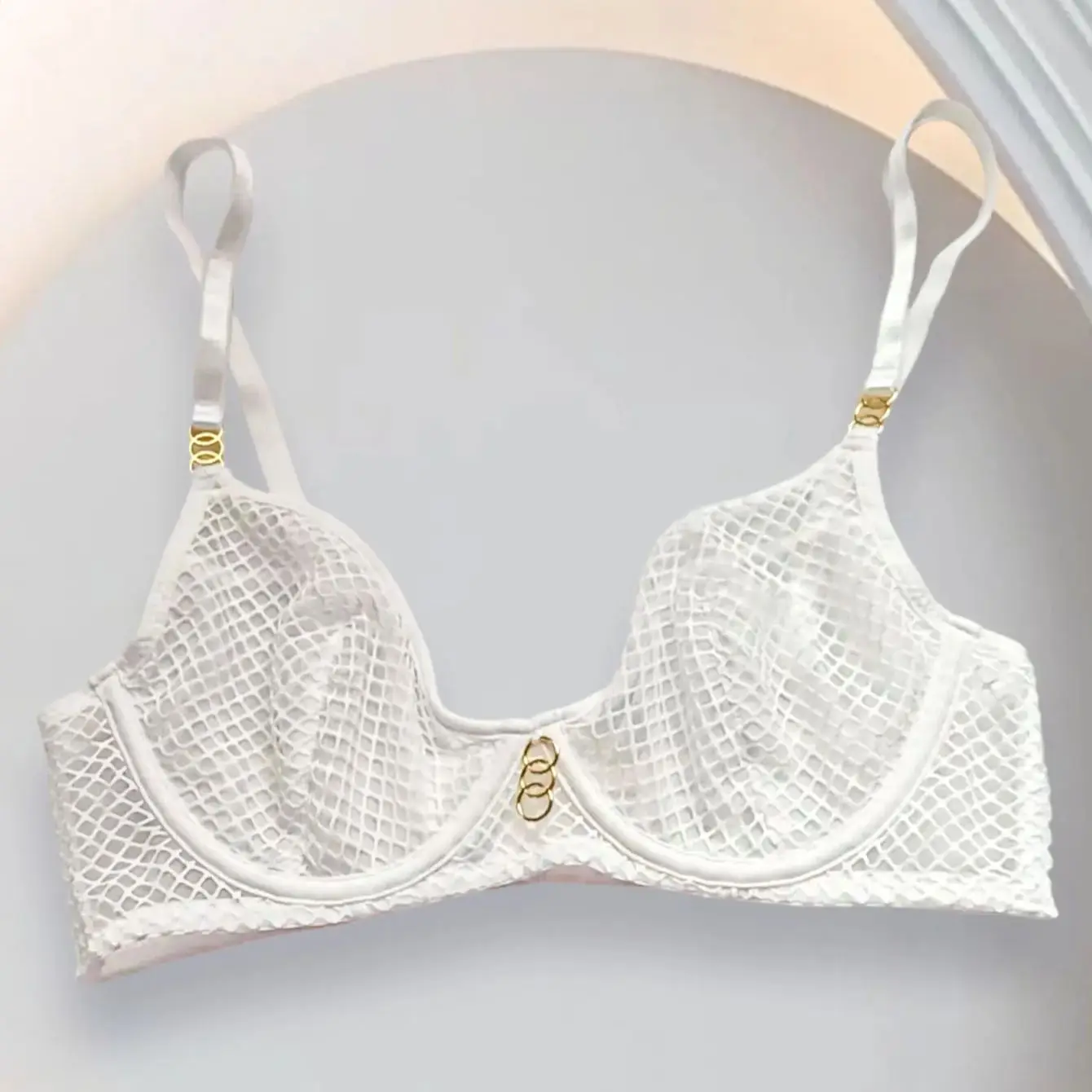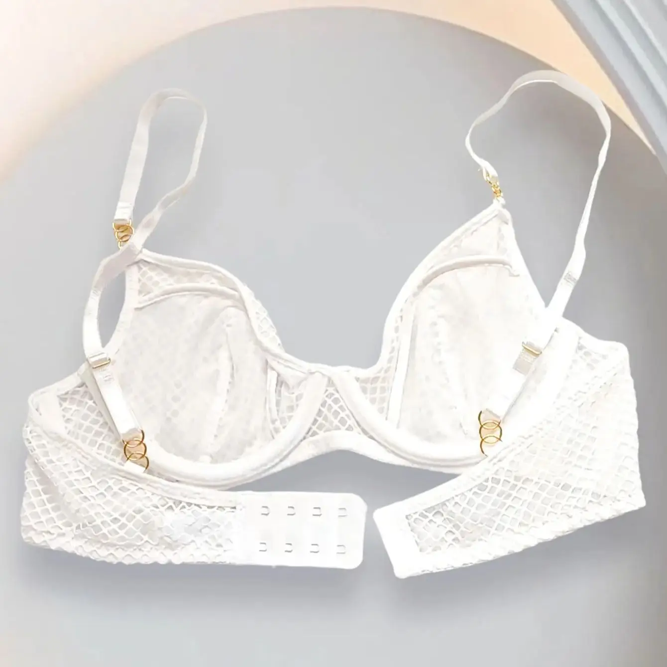 Gold Hardware: Elegant gold metal rings connect the straps to the cups and adorn the center gore, adding a jewelry-like touch to the white mesh.